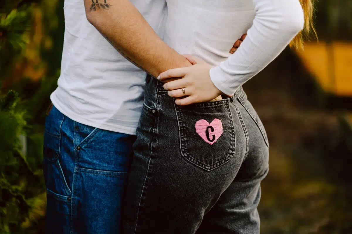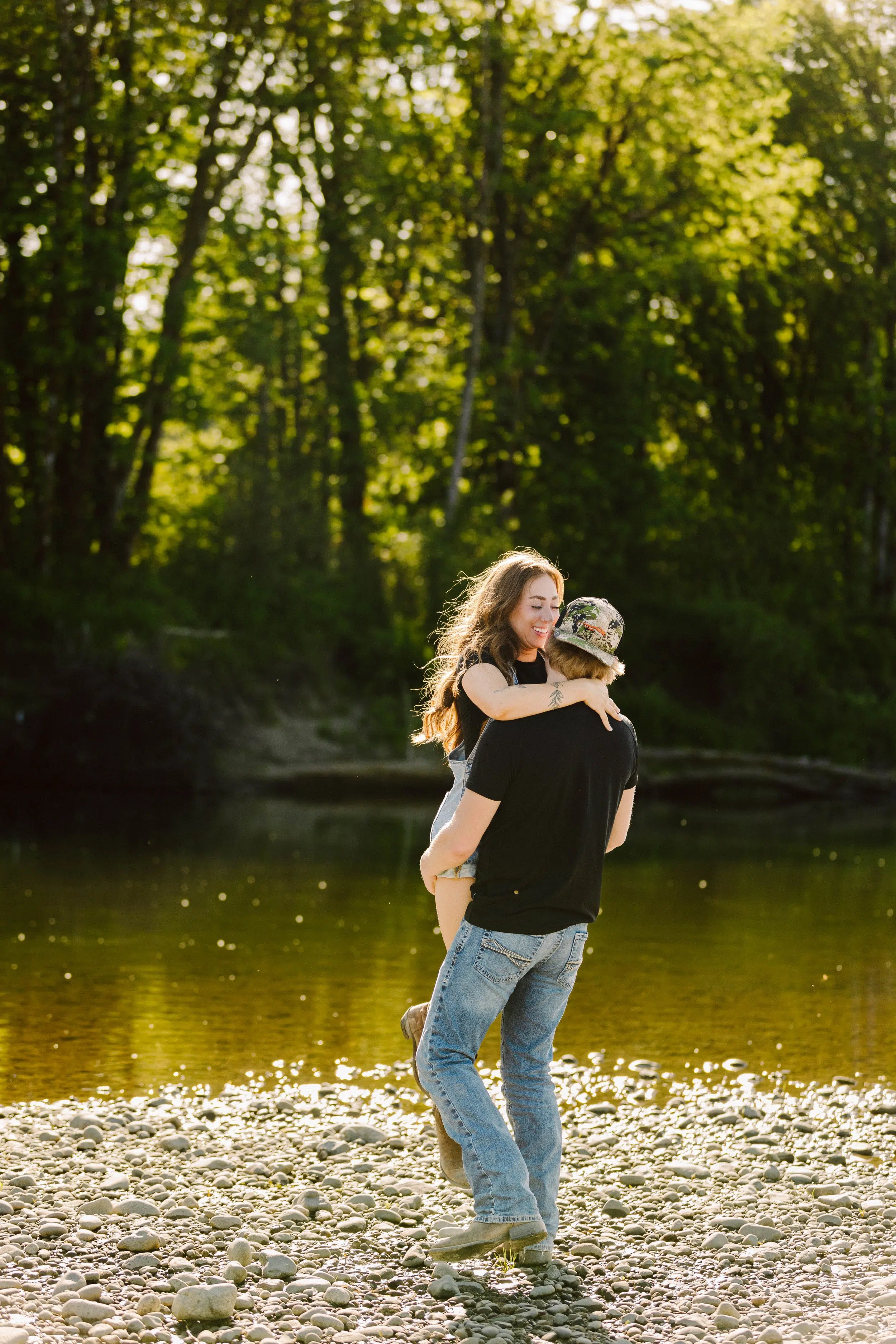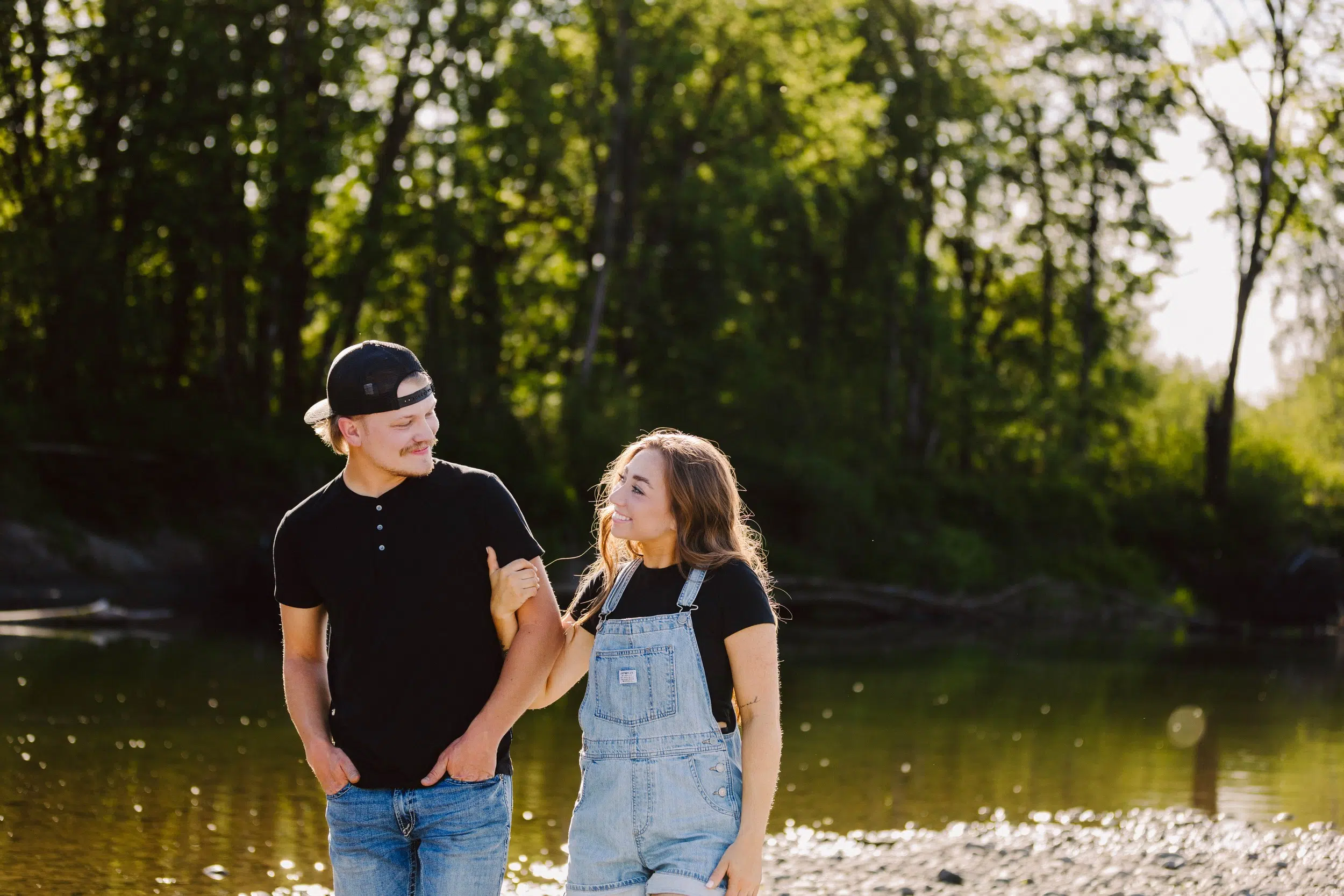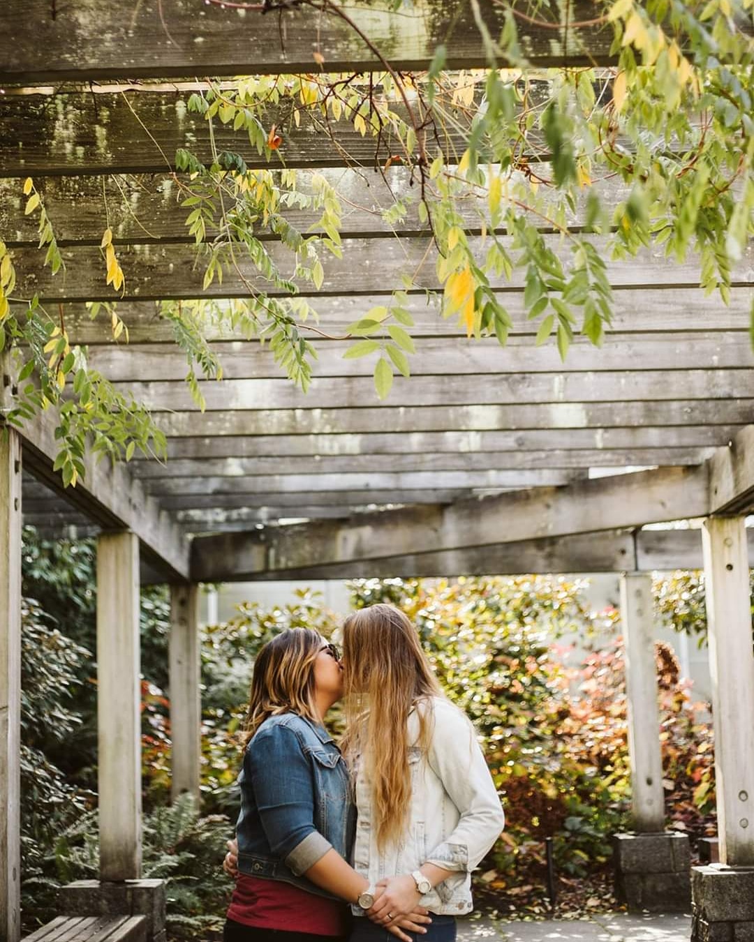 Denim jackets catching sunset light.