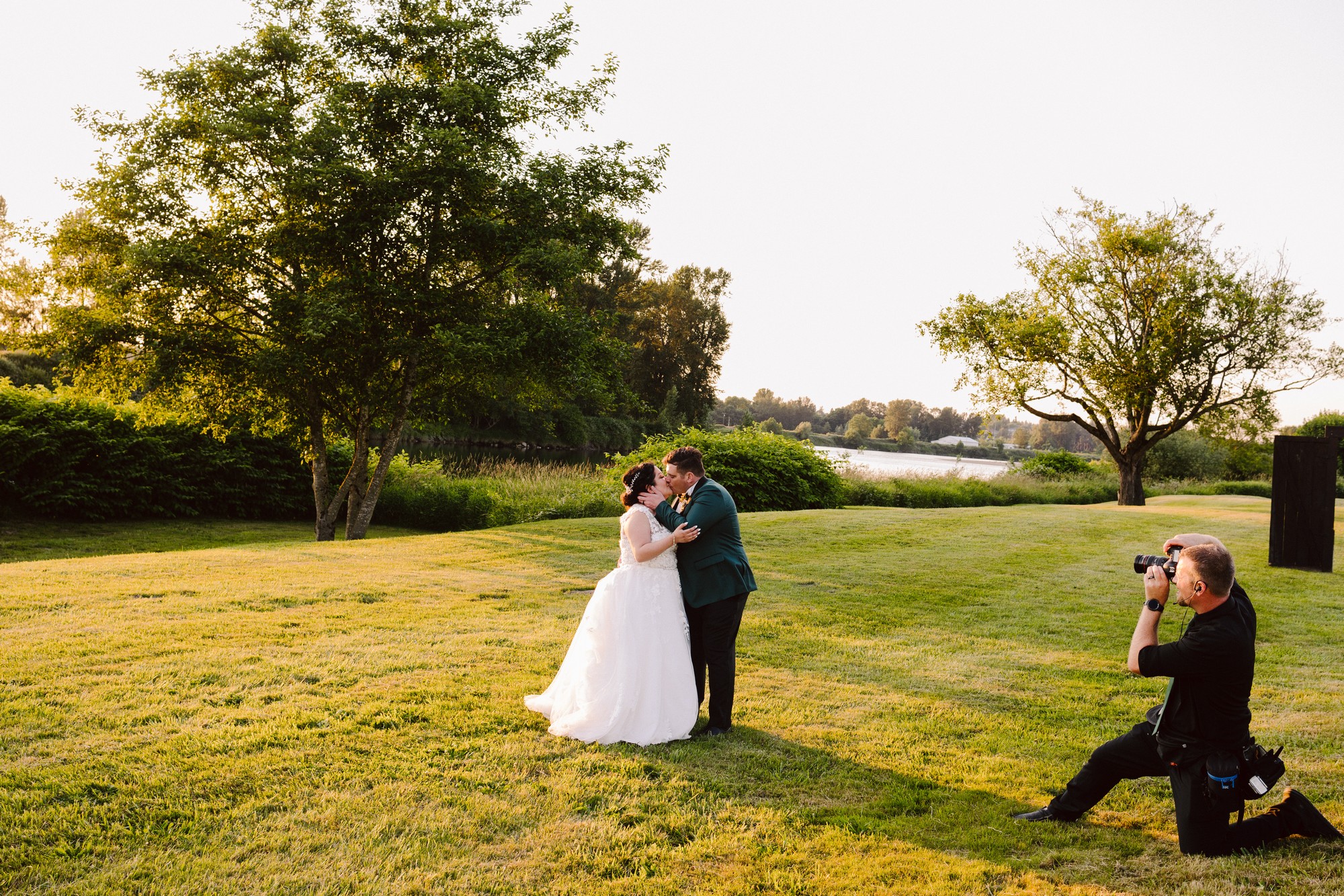 Snohomish Wedding Photographer GSquared Weddings A newlywed couple kisses on a sunlit grassy lawn near a lake, surrounded by trees, while a photographer kneels nearby to capture the moment. Serving Seattle, Snohomish and Orlando