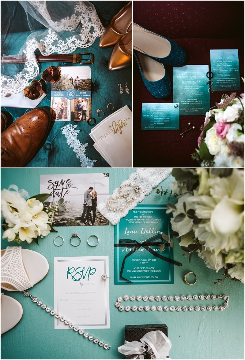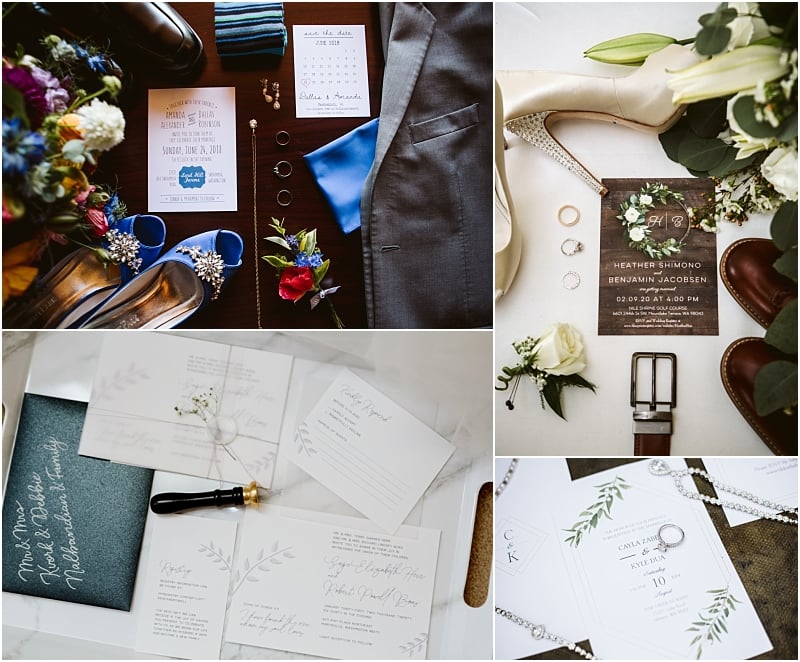 For this part of the inspiration series, we combined a few things that don’t really have a category all their own. Wedding invitations styled in a way that we call a “flat lay” in the industry, and then suits, ties, watches and such, too.