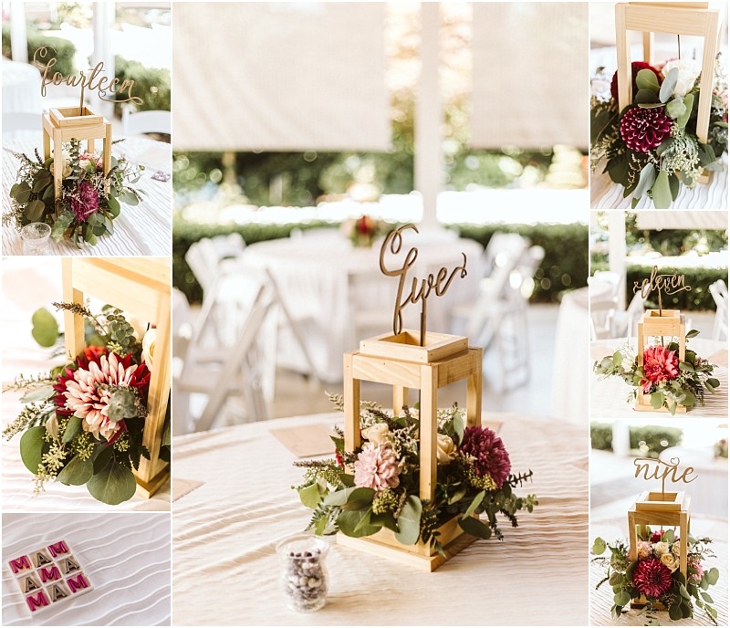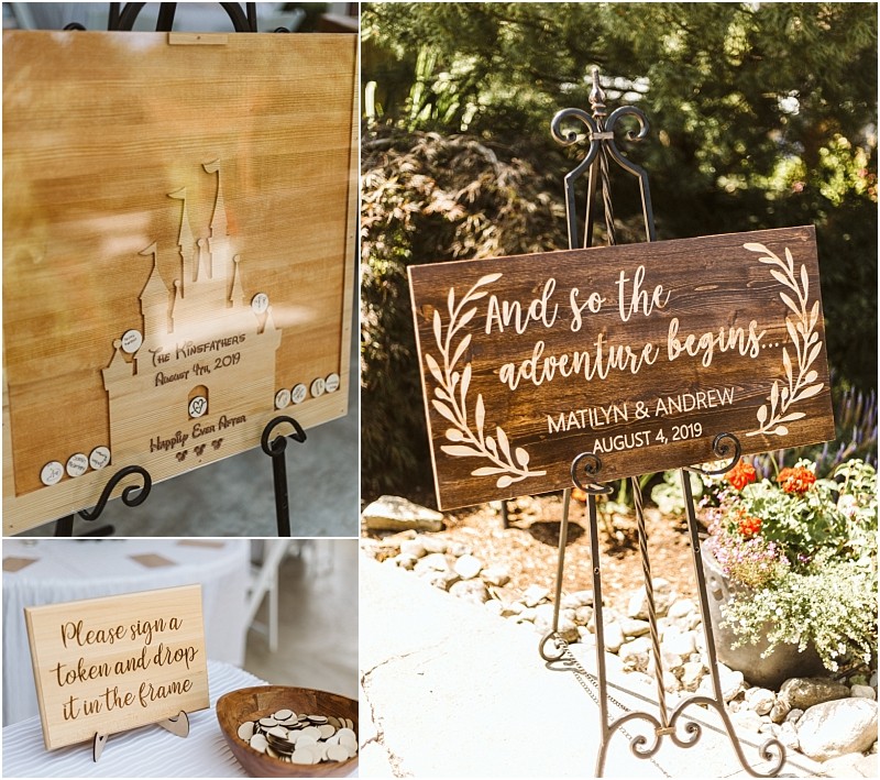 Almost everything is DIY, Our centerpieces are lanterns built by the bride’s mom, all signs are designed and created by the bride’s family, and the guest book (Disney castle with tokens for guests to sign which fall in around it), and “future fund” box were specially designed and created by the bride’s parents (Ransom Workshop, linked above and below). On the wall behind the bridal party table, we will have a selection of our favorite engagement photos on display.