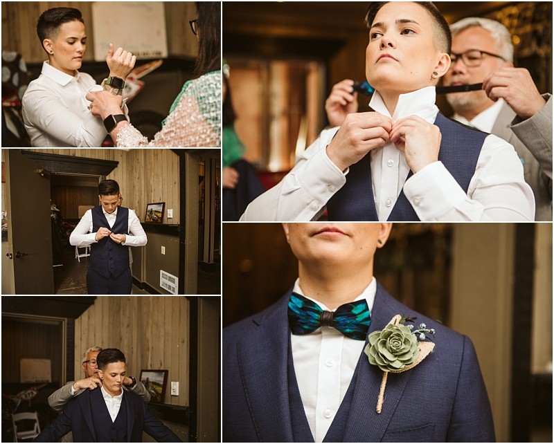 Blue is both of our favorite colors and we went with a palette that would complement the feather bowtie that Jen will be wearing. We also both love movies so Jen and Jacob will be having matching socks – they are green and have the toy soldiers from Toy Story. Jen’s bridal party will also have other Pixar themed socks.